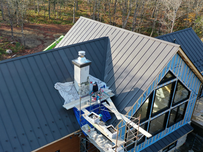 Les lignes marquées et les angles prononcés créent un effet visuel impressionnant, tout en assurant une excellente gestion de la neige et de l’eau. Le choix des couleurs et des finitions a été soigneusement harmonisé avec l’environnement naturel, offrant un résultat à la fois prestigieux, durable et parfaitement intégré au paysage.